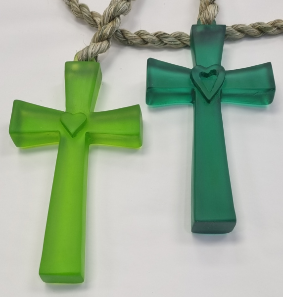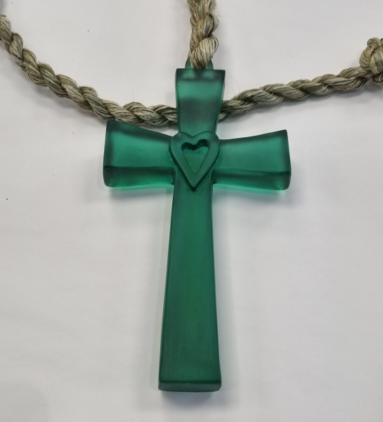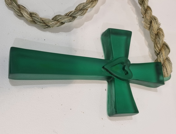 Cast glass cross, hangs from handmade harakeke rope.